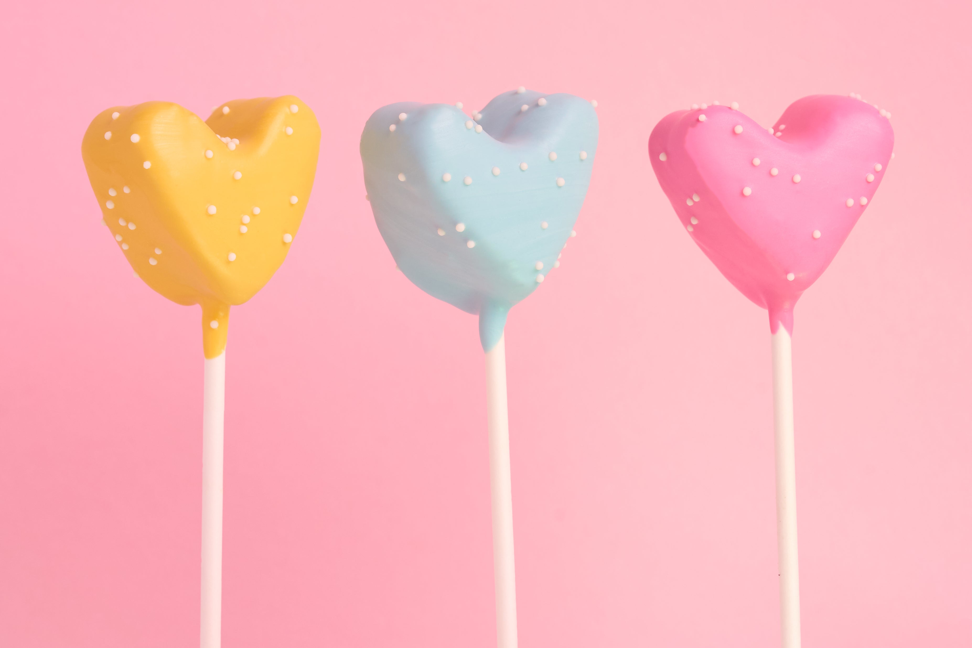 12 Heart shaped cake pops in pink, blue, yellow and purple